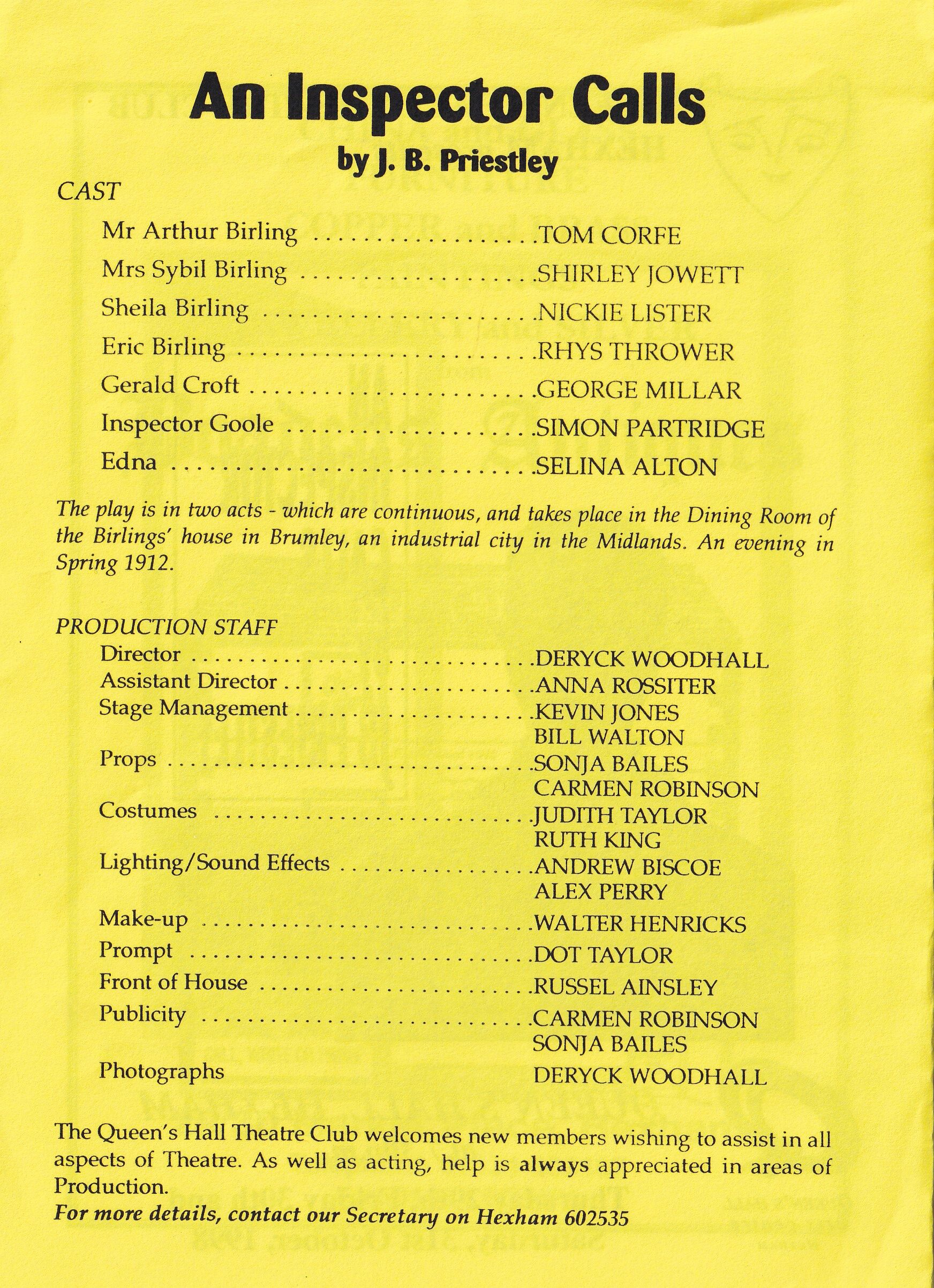 The play revolves around the apparent suicide of a young woman called Eva Smith. The unsuspecting, prosperous Birling family are visited by the mysterious Inspector Goole. He arrives just as they are celebrating the engagement of Sheila Birling to Gerald Croft. The Inspector reveals that a girl called Eva Smith, has taken her own life by drinking disinfectant. The family are horrified but initially confused as to why the Inspector has called to see them. What follows is a tense and uncomfortable investigation by an all-knowing Inspector through which the family discover that they are all in fact caught up in this poor girl's death. An Inspector Calls is scathing in its criticism of middle-class hypocrisy. The play gives voice to Priestley’s strong socialist principles, and carries a clear moral message, stressing the importance of social responsibility: ‘We don’t live alone. We are members of one body. We are responsible for each other’.