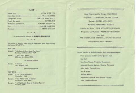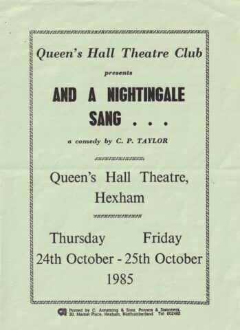 And A Nightingale Sang . . . opens just before the beginning of the war in a house in Newcastle-Upon-Tyne filled with well-meant and bustling domestic chaos. A family try their best to get on with their lives as the bombs fall around them. Helen, who is stoical and self-deprecating and walks with a limp. Her grandfather Andie is recruiting mourners to attend the burial of his dog; her devout Catholic mother is fretting about the health of the local priest; her father is serenading an unwilling audience with the popular songs that light up the whole play. Joyce, Helen’s younger, prettier sister is dithering over whether to accept a marriage proposal from Eric, who is being deployed to France. Helen, depended on for guidance by the whole family, has never had any attention from men – until she meets Norman, who shows her that she can waltz and fall in love.. Telling glimpses of small lives from the edge of momentous events. But for all the family, nothing can be the same after the war