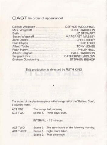 A crazy, but very likeable gang of bookies have hatched a get-rich-quick plan to substitute their decrepit old nag for the odds-on favourite in its next race. The fun starts when, in order to be near the racecourse, they book into a country hotel run by a retired colonel and his wife and daughter. Secret rooms, sliding panels, mistaken identity and a nice little bit of romance are some of the main ingredients of this very racy and slick farce. It never lets up for a moment, relying on split second timing and such high speed action that, like all good farces, the audience has no time to dissect and rationalise the plot!