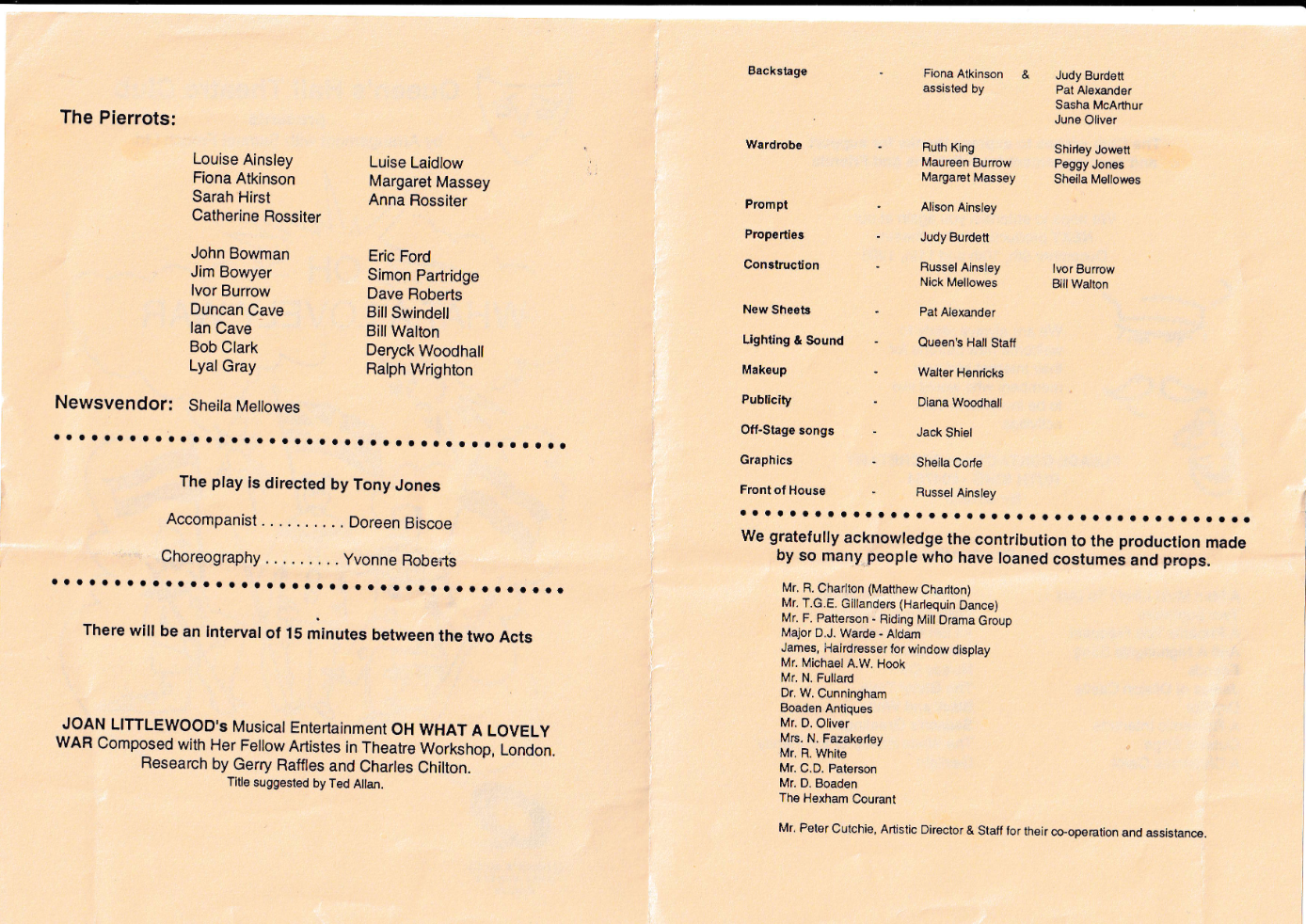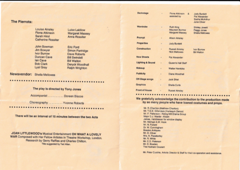 Presented with music and songs, the play is a satire on war and WW1 in particular. It viewed the first world war from the perspective of the common soldier and it counterpointed traditional music hall songs from the era with grim battle statistics. The musical first draws the audience into the sentimentality of the war propaganda and sense of bonhomie that was prevalent at the beginning of the First World War. The true horror of the First World War is then borne out in Act Two. An ensemble cast present a drama that is tragic and deeply moving.
