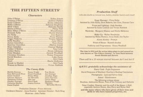 A powerful drama, set against the harsh and turbulent background of poverty and class distinction in Tyneside at the beginning of the last century. It tells the story of one family’s fight for physical and moral survival in the squalor of the dockyard slums of the Fifteen Streets. It includes includes humour, intrigue, tragedy, and love.