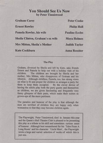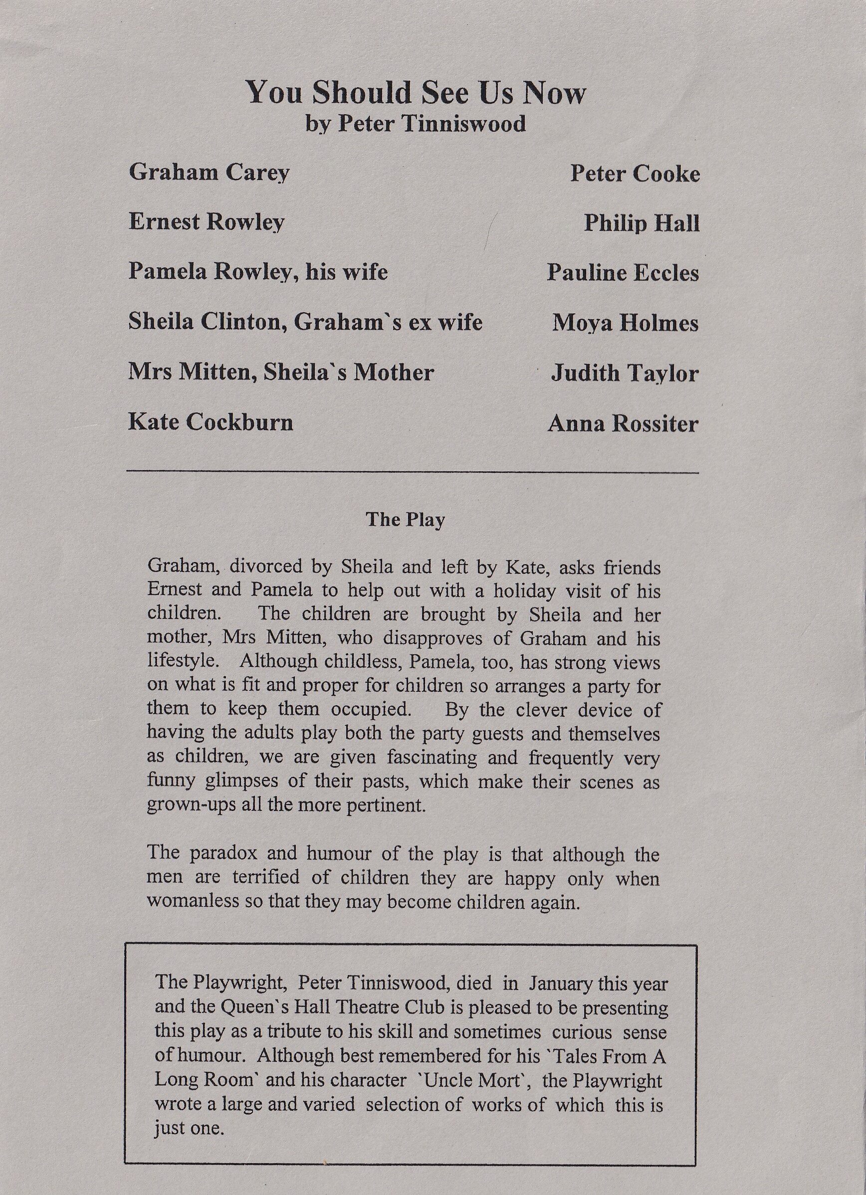 Divorcé Graham asks friends Ernest and Pamela to help out with the holiday visit of his children. The children are brought by his ex-wife and her mother, who disapproves of Graham's lifestyle. Pamela, although childless, has strong views on children and organizes a party for them. By having the adults play both the party guests and themselves as children we are given fascinating and funny glimpses of their pasts, making their scenes as grown-ups all the more pertinent.